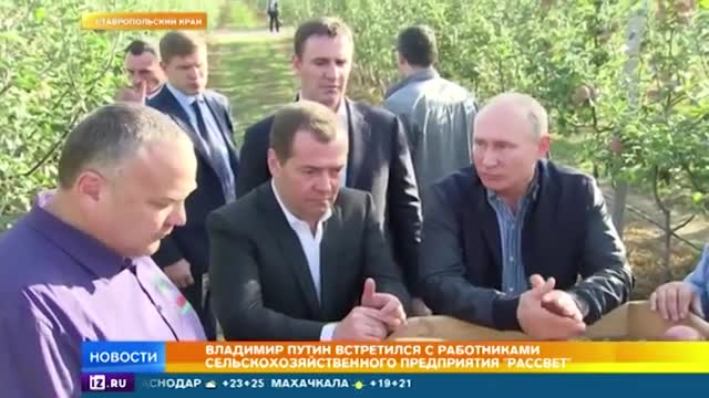 Прежде глава государства решил встретиться с теми, кто непосредственно работает на земле. В сельхозпредприятиии "Рассвет" Путин осмотрел знаменитые яблоневые сады. Уже несколько лет здесь собирают повышенные урожаи, используя передовые технологии.