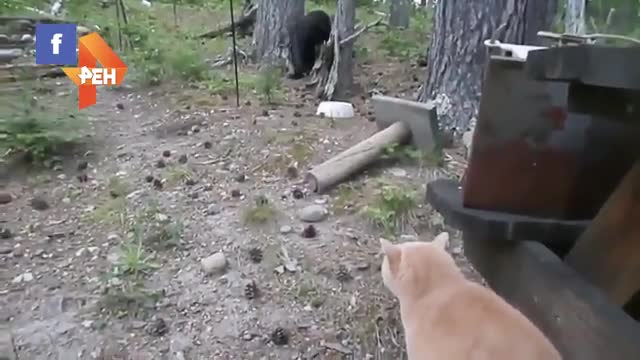 На кадрах видно: медведь изучает территорию, в то время как кот за ним следит. После чего кот подкрадывается к медведю, а потом с шипением нападает. Медведь, испугавшись, забирается на дерево.