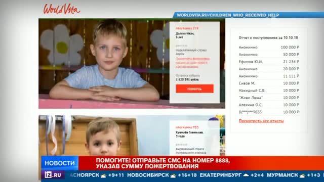 Мы гарантируем: все деньги поступят на счета подопечных фонда WorldVita. Для спасения жизни ребенка не нужно много усилий. Достаточно отправить SMS-сообщение на короткий номер 8888, указав в тексте любую сумму — это может быть 100, 200 или 500 рублей, или сделать банковский перевод, воспользовавшись кредитной картой. Все реквизиты, инструкции и детальный отчет о каждой потраченной копейке — на сайте worldvita.ren.tv. Спасибо вам!