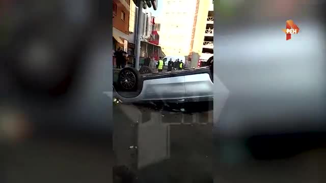 В распоряжении РЕН ТВ появились фото и видео с места падения автомобиля со второго этажа паркинга в ТЦ "Горбушкин двор".