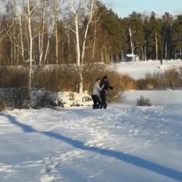 На видео мужчина, заметив, что человеку на льду требуется помощь, бежит его спасать, после чего на несколько мгновений исчезает за сугробом и появляется в кадре уже с пострадавшим.