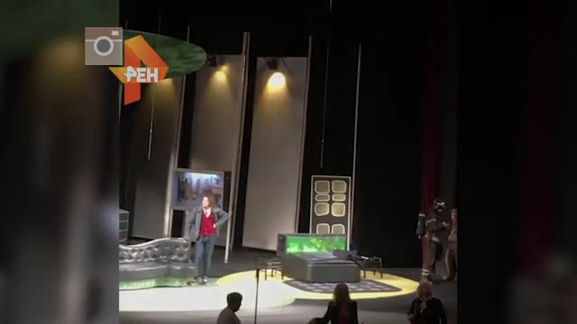 Спасателям пришлось забираться прямо на сцену к актерам. Удивленные зрители поприветствовали их аплодисментами. Проводить их со сцены они также решили овациями - и один из сотрудников МЧС не растерялся и помахал залу.