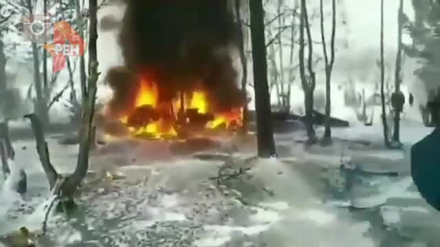 На этих кадрах потерпевшая крушение машина охвачена пламенем, валит густой дым.