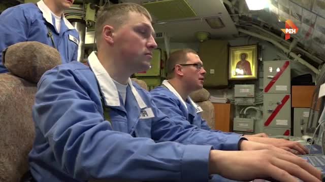 На кадрах видно, как работает экипаж подлодки. На судне звенит тревога, после чего экипаж приступает к боевым действиям.