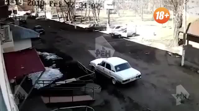 Если присмотреться, видно, как водитель пытается ползком выбраться из взорванного "Ларгуса".