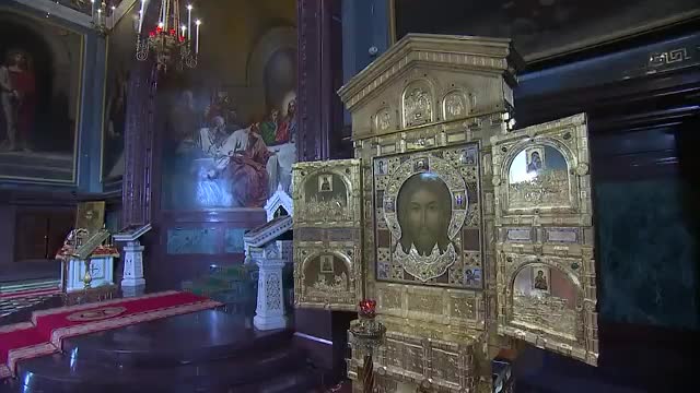 После пасхального богослужения в храме Христа Спасителя патриарх Московский и Всея Руси Кирилл освятил икону "Спас Нерукотворный", предназначенную для главного храма ВС РФ.
