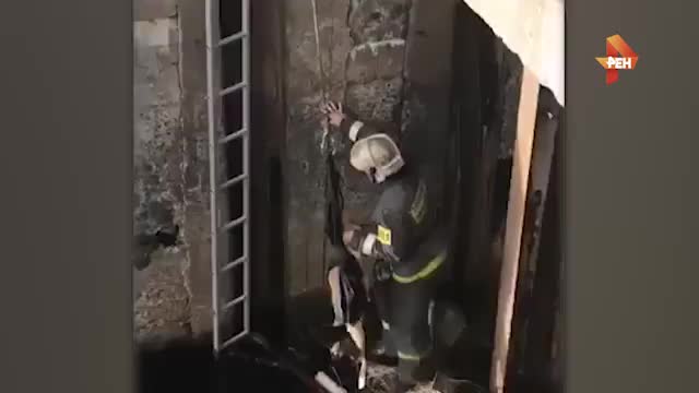 На кадрах видео видно, как спасатели с помощью техники и шлейки поднимают пса из воды. Собака даже пытается помочь своим спасителям и отталкивается от стены лапкой.