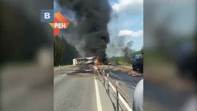 На кадрах видно, что фура перевернулась на дороге и завалилась на левый бок. При этом пожар не стихает, а густой черный дым застилает небо.