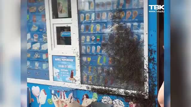 В Красноярске рой пчел облепил витрину киоска с мороженым. Видео распространилось в социальных сетях.