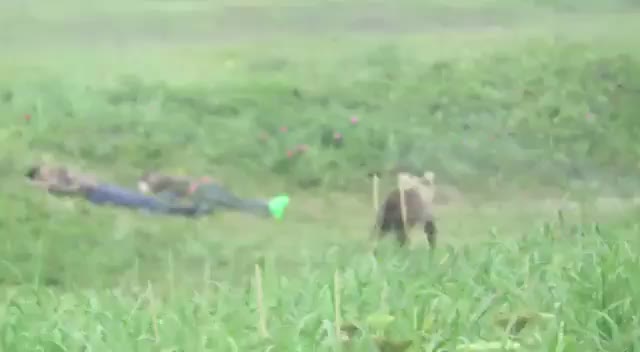 Когда животное начинает их обнюхивать, один из мужчин просыпается и резко вскакивает, чем отпугивает малыша. От криков первого просыпается и второй мужчина, однако медвежонок уже уходит гулять дальше.