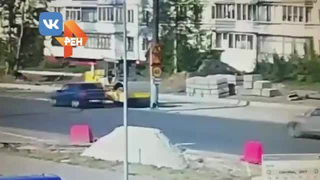 Как видно на кадрах записи, каток, укладывавший дорожное покрытие, врезался прямо в мачту городского освещения. Из-за этого она упала на дорогу, провода оборвались и заискрили.