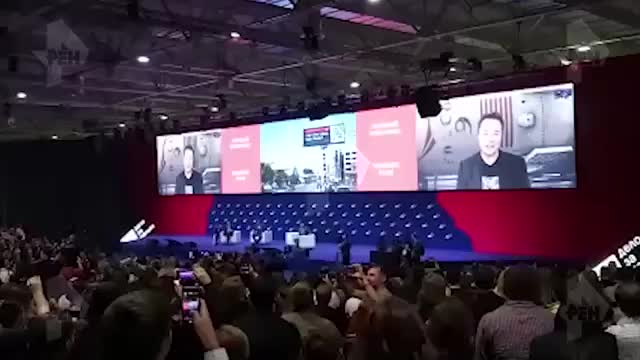 "Я бы с удовольствием... Но это будет сложно сделать. Желаю вам всего наилучшего в ваших дальнейших предприятиях", — сказал Маск, после чего зал зааплодировал ему.