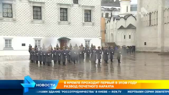 В эти минуты у стен Кремля проходит одна из самых зрелищных церемоний. Это первый с начала года развод конных и пеших караулов Президентского полка.