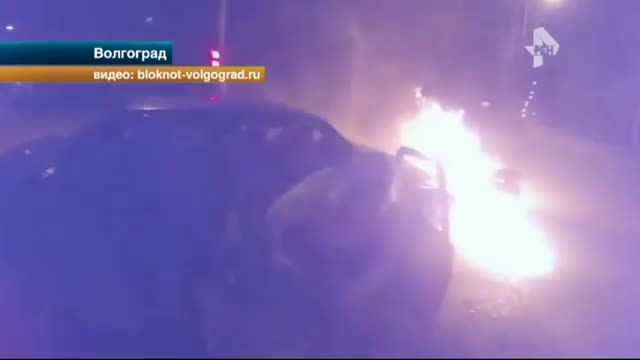 Столкновение происходит за считанные секунды. После удара о машину мотоцикл охватывает пламенем. Из автомобиля с криками выбегают люди.