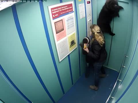 Камера видеонаблюдения, установленная в лифте, зафиксировала, как в кабину вошли женщина с ребенком. Когда дверь лифта закрывалась, туда проскочила небольшая собака, которую хозяева держали на поводке.