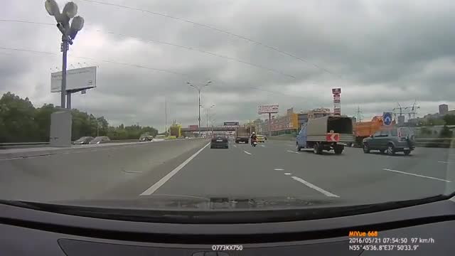 Регистратор снял, как байкер пал жертвой дорожных работ. Ремонтируемый участок дорожного полотна стал непреодолимым препятствием для мотоциклиста, двигавшегося по внешней стороне МКАД в районе Реутова.