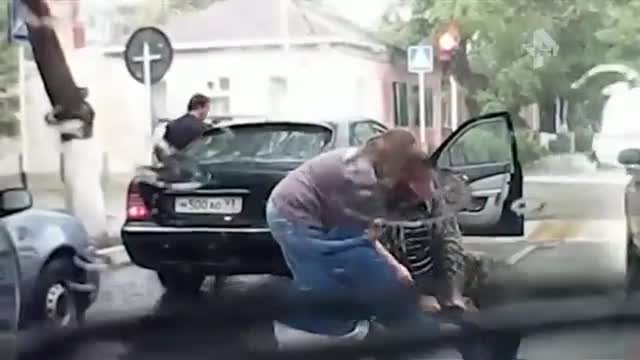В Краснодарском крае видеорегистратор зафиксировал драку водителей на проезжей части. Мужчин, пытающихся разобраться "на кулаках", не смутили ливень и машины с очевидцами.