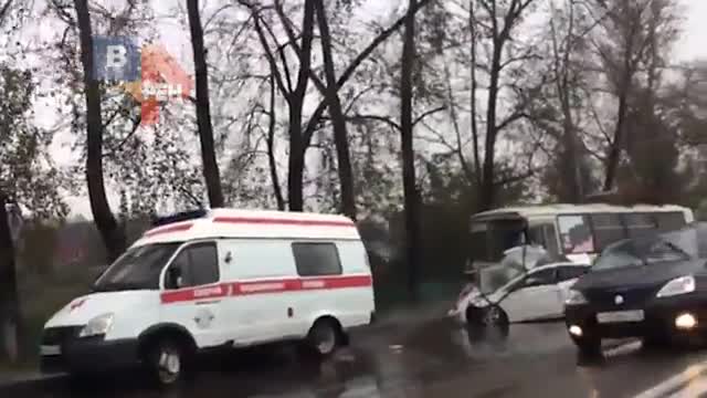 На кадрах видно, что иномарка угодила под автобус и передняя часть машины от столкновения практически полностью разрушилась. На месте происшествия продолжают работать экстренные службы.