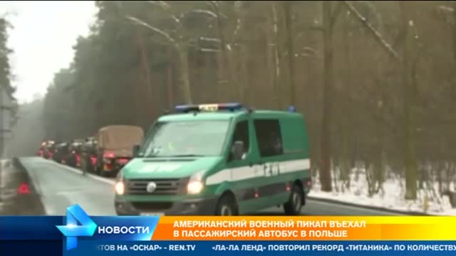 Американская армия - серьезная сила, и это факт, готова ответить на угрозу в любой точке земного шара. Вот только справиться с зимними польскими дорогами им оказалось не под силу. За минувшую неделю это уже вторая авария. Пикап армии США врезался в автобус, пострадали двое местных жителей. А ранее один из грузовиков, который вез снаряды для танков, занесло, он улетел в кювет - амуниция просто рассыпалась по трассе. Ее собирали почти сутки, полностью перекрыв движение.