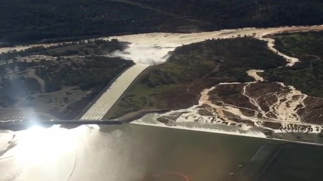 Жители Калифорнии публикуют в Сети видео дамбы, оказавшейся под угрозой прорыва. На записи, сделанной с воздуха, видно, как дамба сбрасывает мощные потоки воды в реку.