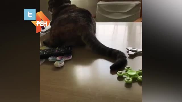 Усатый и хвостатый любитель спиннера живет в Японии. По кадрам видеоролика можно судить, что кот серьезно подходит к своему увлечению: на столе рядом с ним целых три спиннера. Один из них он крутит хвостом, демонстрируя при этом абсолютное спокойствие и даже не поворачивая к игрушке головы.