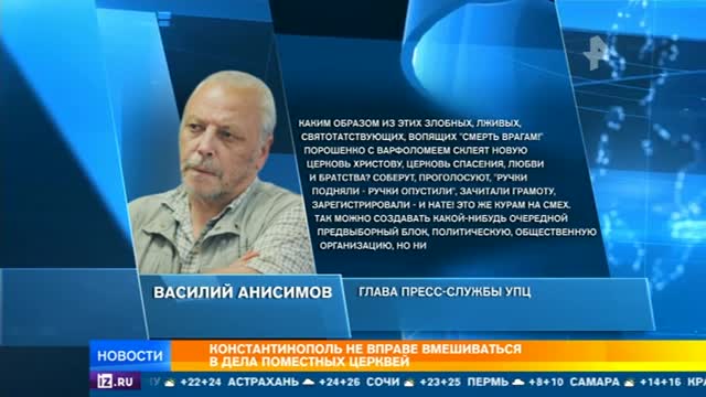 "Каким образом из этих злобных, лживых, святотатствующих, вопящих "смерть врагам!" Порошенко с Варфоломеем склеят новую Церковь Христову, Церковь спасения, любви и братства? Соберут, проголосуют, "ручки подняли — ручки опустили", зачитали грамоту, зарегистрировали — и нате! Это же курам на смех. Так можно создавать какой-нибудь очередной предвыборный блок, политическую, общественную организацию, но никак ни Церковь", — заявил глава пресс-службы УПЦ Василий Анисимов.