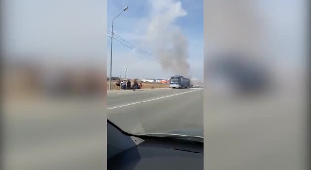 Очевидцы запечатлели на видео автобус, охваченный пламенем, который мчался по трассе